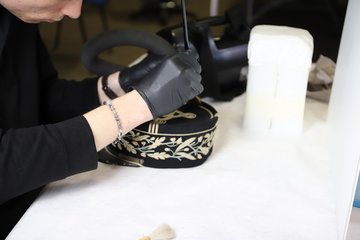 Ce pointage réalisé, les coiffes ont fait l’objet d’un dépoussiérage précautionneux. Avant toute manipulation, les objets ont été scrupuleusement regardés afin d’adapter au mieux la méthode et éviter de dégrader les pièces les plus délicates. Impossible d’être frivoles avec des coiffes parfois très fragiles ! Pinceaux en poils de chèvre et aspirateurs de conservation ont permis de redonner éclat et panache à ces coiffes militaires.